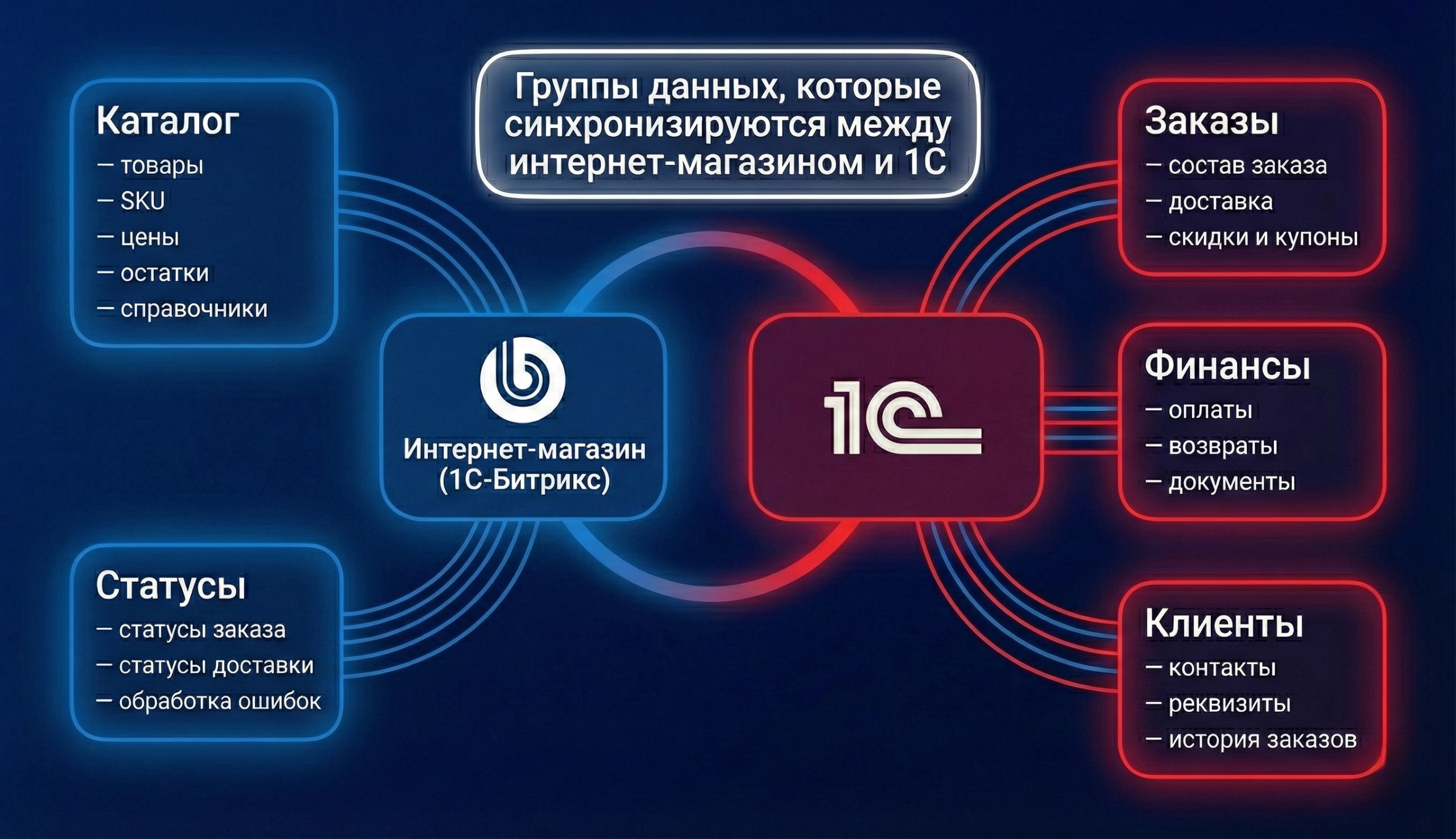 Самый распространенный сценарий — интеграция с классическими учетными системами, такими как 1С:Предприятие или «МойСклад». Здесь критически важно настроить протоколы обмена и разграничить зоны ответственности. Рационально использовать схему, при которой система учета остается мастером по складским остаткам и базовым ценам. Сайт забирает эти данные, но не имеет прав на их изменение. В обратную сторону передаются только заказы и статусы оплат, что защищает складскую программу от некорректных данных из веба.