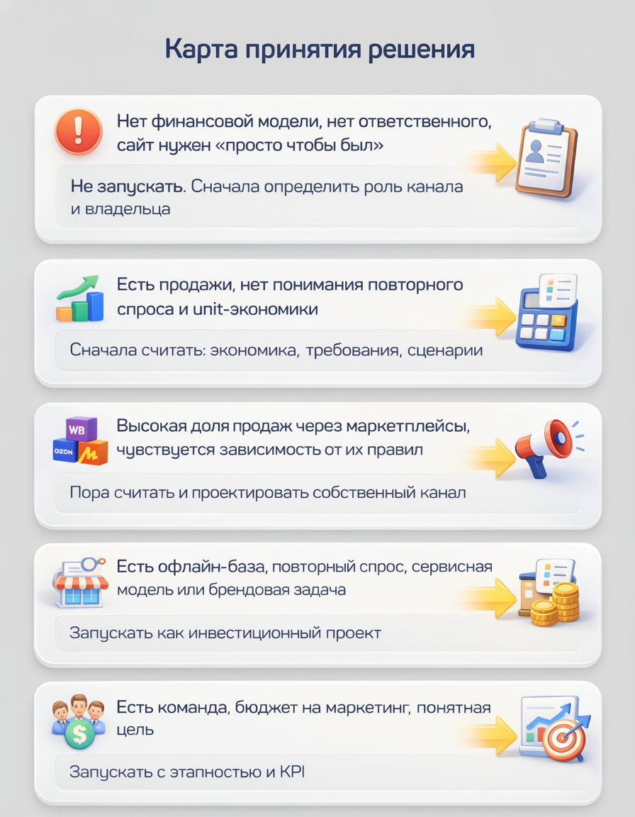 Комбинируем. Маркетплейс даёт объём и доступ к новой аудитории, а сайт даёт базу, повторные продажи и управляемую экономику.